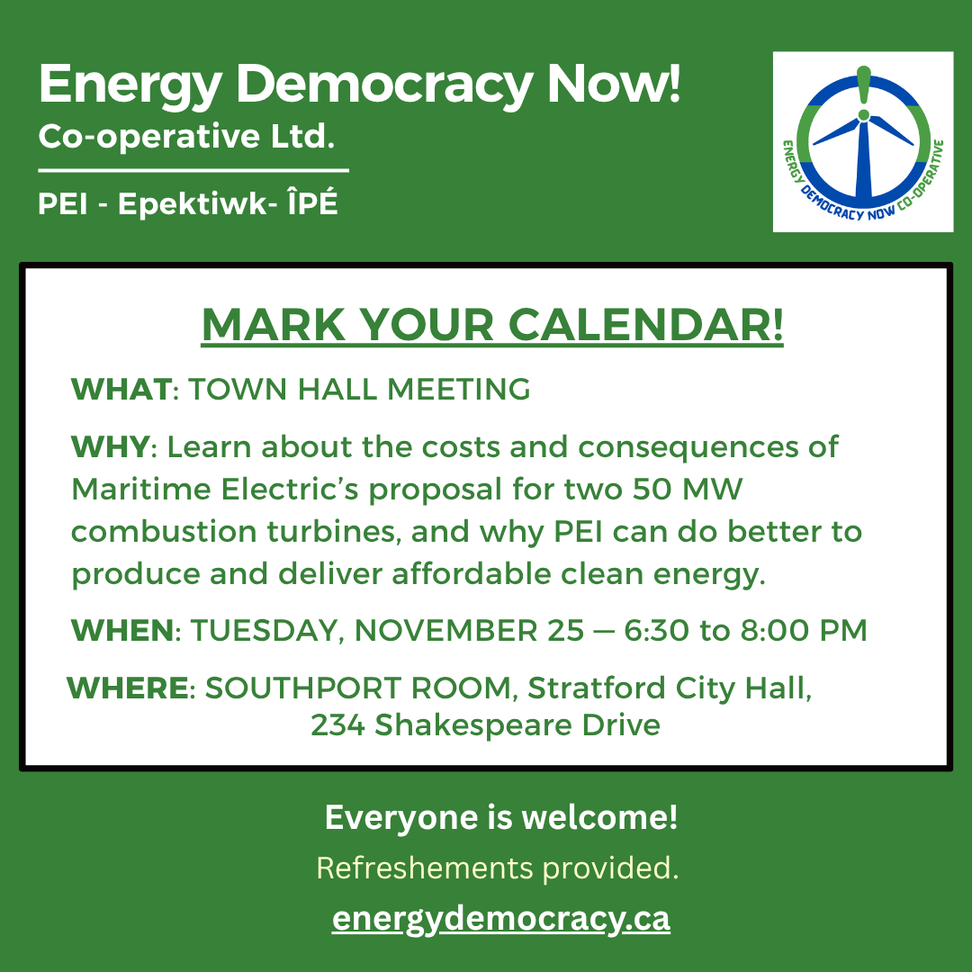 Islanders Deserve a Say in Their Energy Future Islanders are being called together to take action for a more sustainable and democratic energy system. Energy Democracy Now! Co-operative Ltd. is hosting a Town Hall Meeting to learn about the costs and consequences of Maritime Electric’s proposal for two 50 MW combustion turbines, and why PEI can do better to produce and deliver affordable clean energy. Islanders deserve: ✅ Affordable clean
